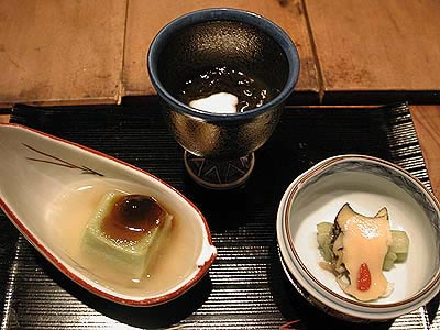 ![]() 酢の物 トマトのゼリー おくらとろろ 海老 オリーブ油掛け イタリアンな味わいでした |