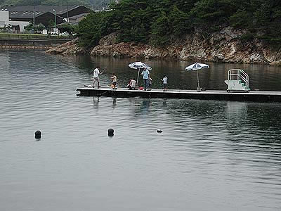 雨の中、釣りを楽しむ家族の姿が |