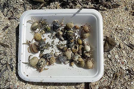 | 残波ビーチ近くの海岸には小さなヤドカリが沢山います。 それを見た次男は、何を食べているのかな?って言うので、夏休みの自由研究はそれにしたらと提案したら食いついて きました。 |