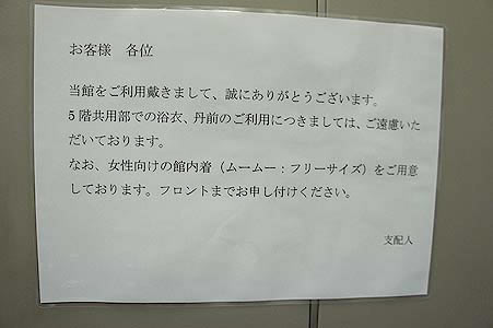 ![]() エレベーターの中に張り紙があり 女性向けの館内着があるとの事 今回は見る機会がありませんでした |