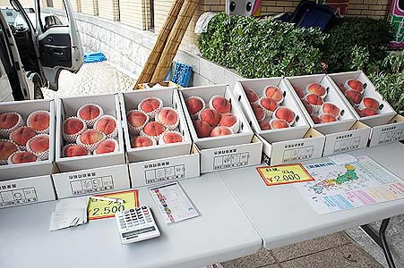 ![]() エントランス前では桃の販売 手で剥くのでベッタリしますが、試食は食べ放題です それ以上に、このオジサマのトークが面白い! |
