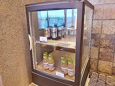 | 冷蔵庫 ビール550円、ジンジャーエール385円(税込) オレンジジュースとりんごジュースは無料 |