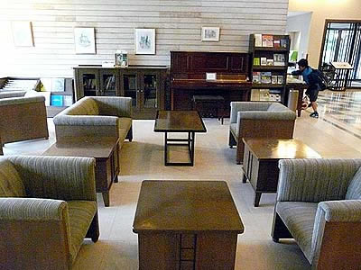 ロビーから、芝生のお庭に出ています