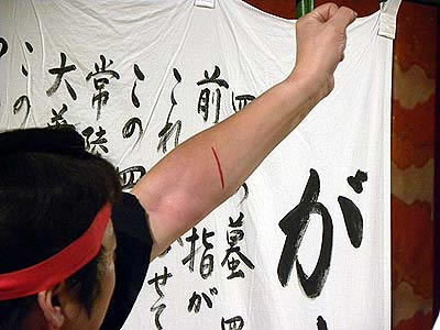 ![]() 太刀を取り出して 切れ具合を示すため、半紙を切って行きます |