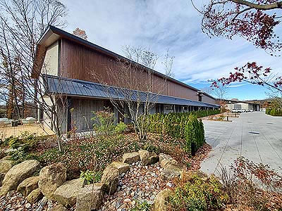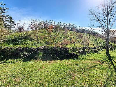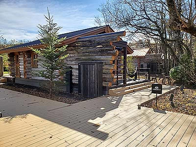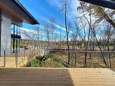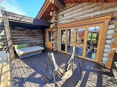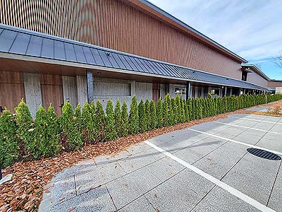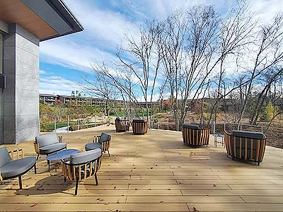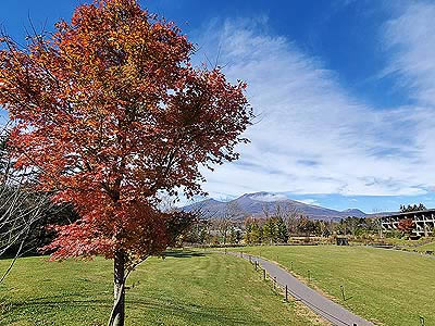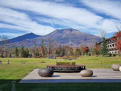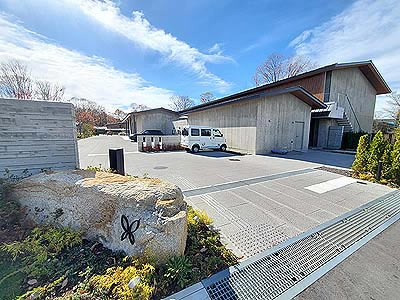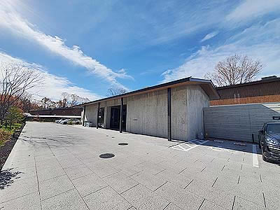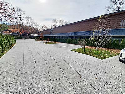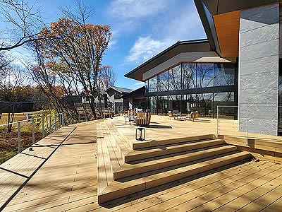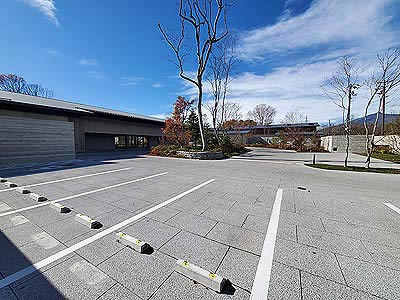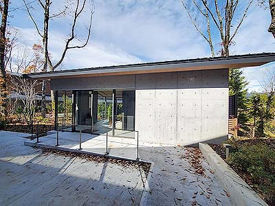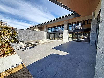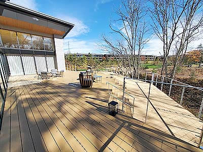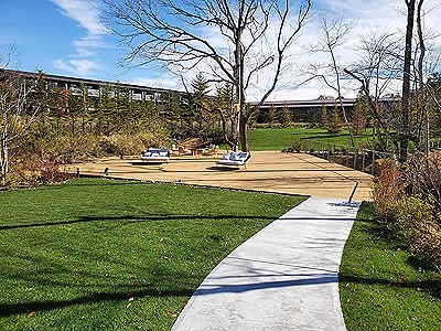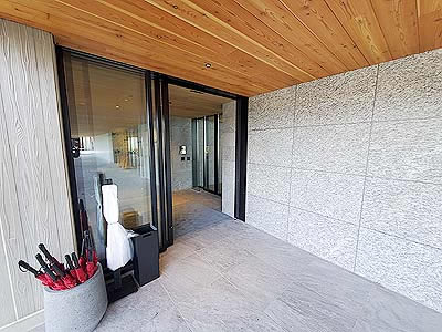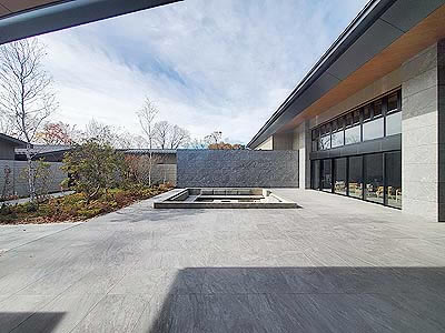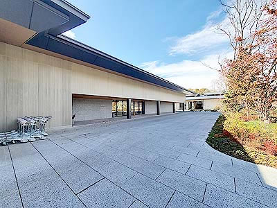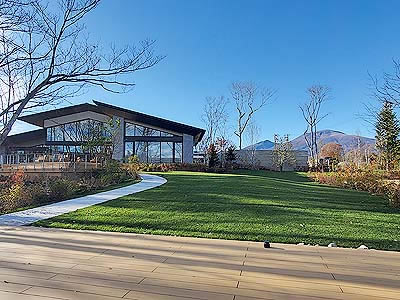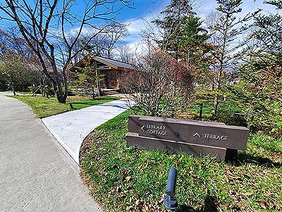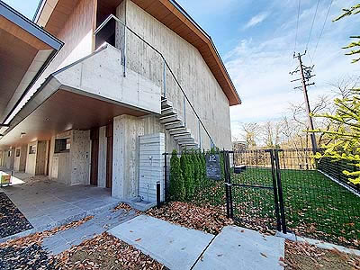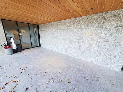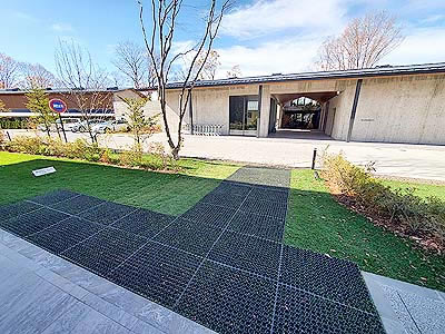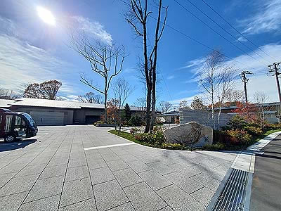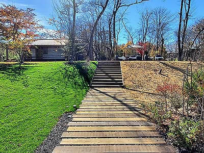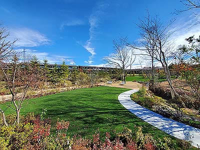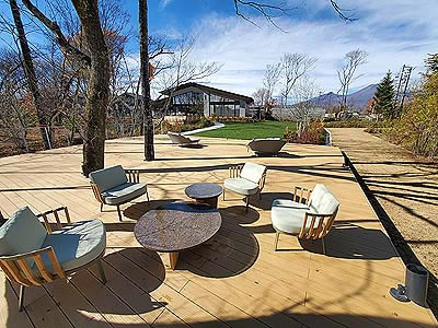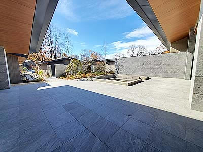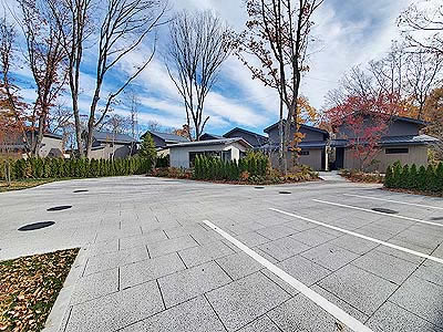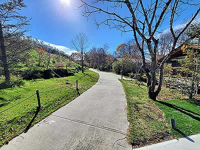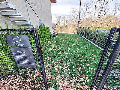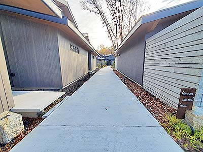 ファイヤーピットの奥にはガーデンの戸建ての通路