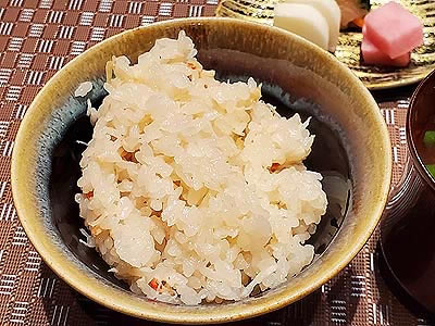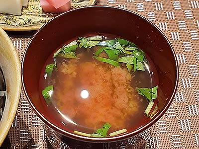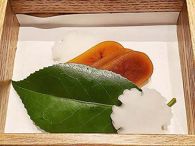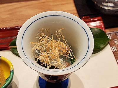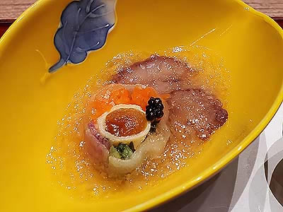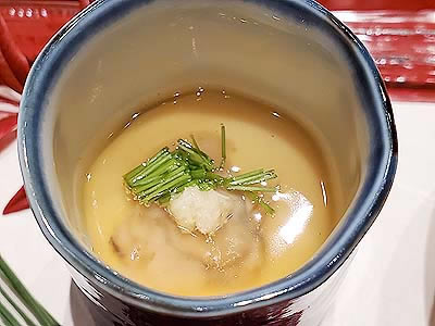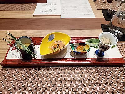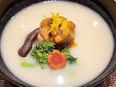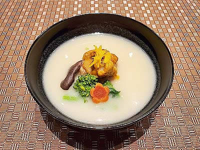 ![]() 白味噌仕立て 雲丹葛打ち 海老芋豆富 平茸 菜種 針柚子 |
