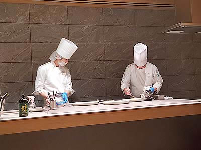 ![]() カウンターでは先程の和食とは違う 洋食の料理人が仕上げをしています |