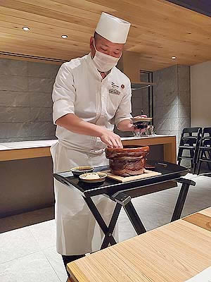 ![]() 食事が始まると、和食の料理人がカウンターで仕上げ |