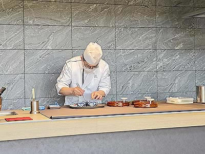 カウンターで和食の盛り付けが始まります