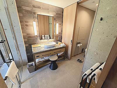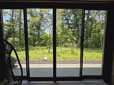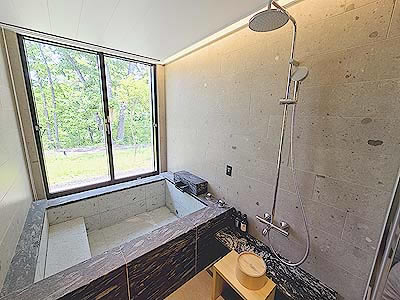 | 温泉の出るバスルーム | 窓が大きく開閉する半露天風呂 軽井沢の空気を温泉とともに楽しめます |