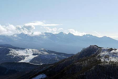 | ブランシュたかやまスキーリゾートの山頂からの眺めを楽しんだあとはゲレンデに出て滑ります。 以前はガリガリで、とっても硬いバーンで、かなり滑りにくかった印象の残るブランシュたかやまのゲレンデは、ふかふかとまでは言わないまでも、けっこう良い感じで、子供たちも安心して滑れます。 |