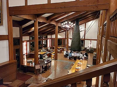 ![]() 食後、ラウンジへ行くと暖炉の回りでゲストが談笑 |