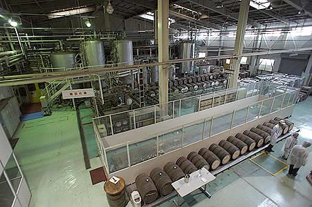 | まずは白衣を来て工場見学 一般見学コースの他に 通常は見る事ができない連続蒸溜機等を見て、説明を受けました |