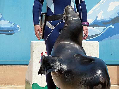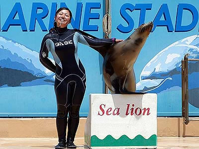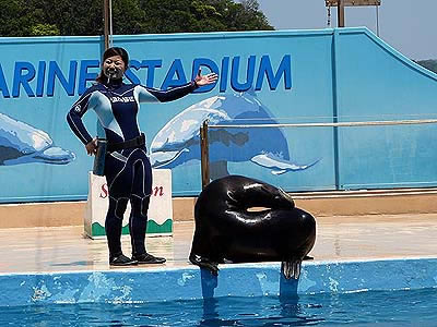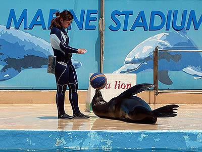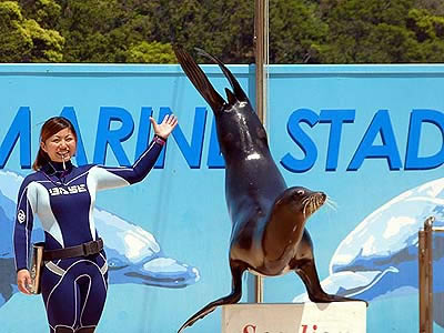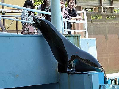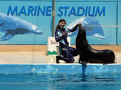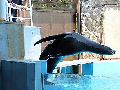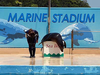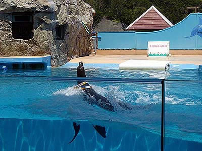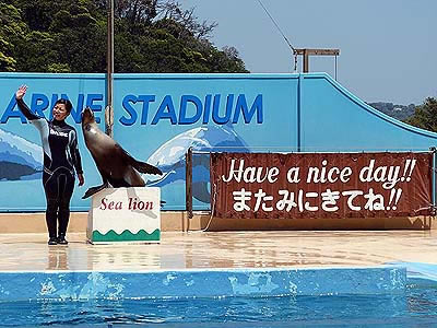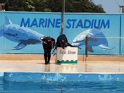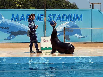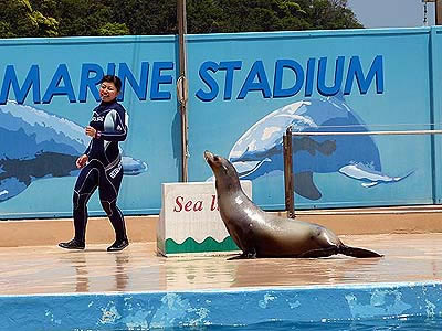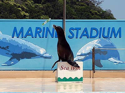 海の生物館シーパレスの展示を見終わると、すぐにマリンスタジアムのアシカショーの始まりです。 |