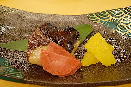 | 焼物 伊根ぶり味噌漬け 網笠柚子・千枚赤蕪 |