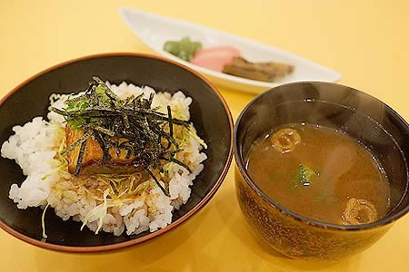 ![]() 食事 ぶりのステーキ小丼ぶり 赤出汁 香の物 |