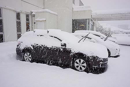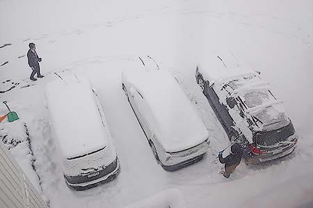 大雪の翌朝、湖では赤い旗を掲げた漁師さんが、貝類を捕っていました