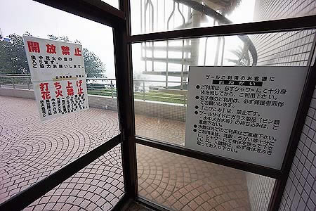 ![]() エントランスにはプール利用の注意書き |