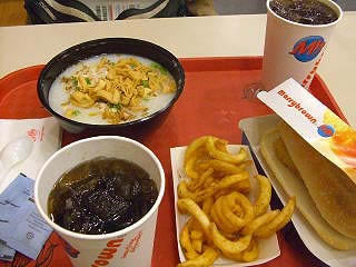 ![]() マレーシアに入国後、最初の食事は ファーストフードでフィッシュサンドとお粥とコーラ。 |