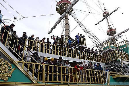 | 大混雑のアッパーデッキ | 桟橋にはロワイヤル号 17世紀フランスの帆船戦艦ソレイユ・ロワイヤル号を モデルに建造された船です |