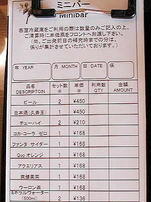 | 冷蔵庫内の飲み物の料金表 | 引き出しにはナイトウェア スパ(廊下)への着用可能ですが、羽織る物が無いので恥ずかしい |