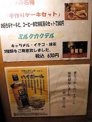 | ラウンジ横にはバーカウンター | ミルクカクテル(630円)とハイボール(420円)の案内 420円はとってもお値打ち! |
