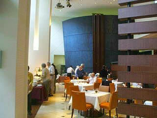![]() レストランの天井が高く、上の壁にプロジェクターで 朝のニュースを映しています。これは良いサービスです。 |