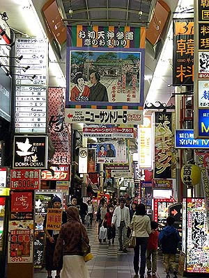 | 雨のため、みさき公園を予定より早く切り上げたので時間が出来ました。 私は、一昨日から清志朗の歌をがなりたくて、カラオケボックスに行こうと提案しました。 次男は大賛成をしてくれたものの、妻と長男が、せっかく大阪まで来たのにもったいないと言い出して、確かにそうだと思いなおし、雨の日の場合の逃げ込み先に考えていた吉本笑店街(よしもとしょうてんがい)に行くことにしました。 |