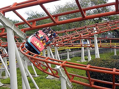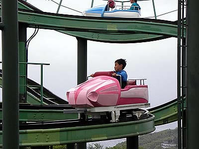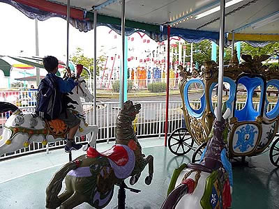 | 生駒山上遊園地(スカイランドいこま)はゴールデンウィークにもかかわらず、天気予報が良くなかったからか、ガラガラと言っていい空きようだったので、午前中に沢山のアトラクションに乗れました。 この日は2009年GW関西のユルイ感じのテーマパークを巡る旅の最終日で、三島に帰らなくてはなりません。 サクッと昼食を頂いて、まだ乗っていないアトラクションと、もっと乗ってみたいアトラクションを楽しみます。 |