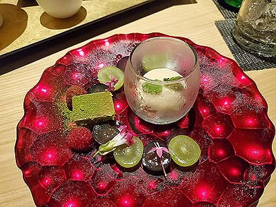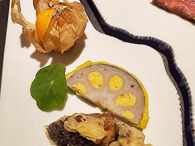 ![]() 肉料理 松坂牛炭火焼きをトリュフ香るぽん酢ソースで 松茸うす衣揚げ 芥子蓮根 ストロベリートマト レモン 葉物 岩戸塩 |