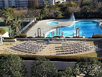 ![]() 私もお庭に下りて、先ずホテルの写真を撮りました フランス料理レストラン ラ・ペール前から デザインプール越しのホテル |