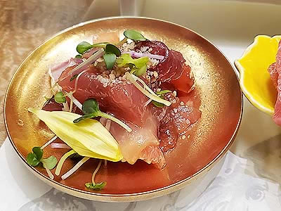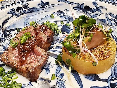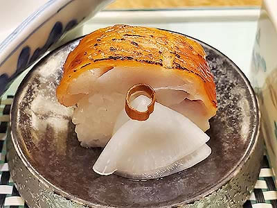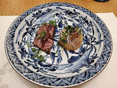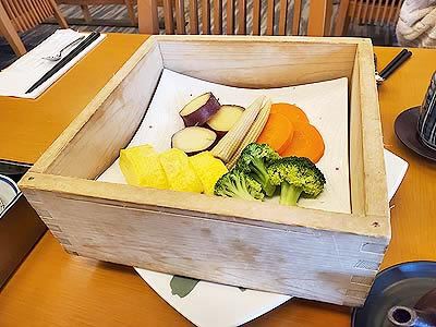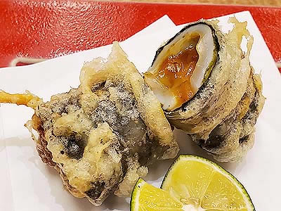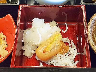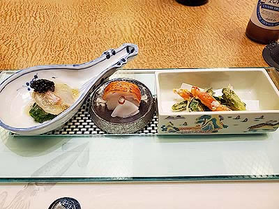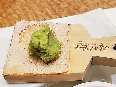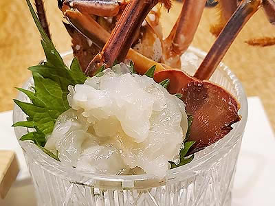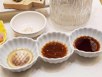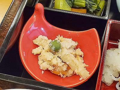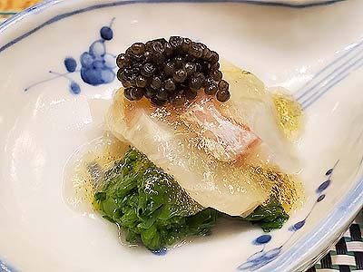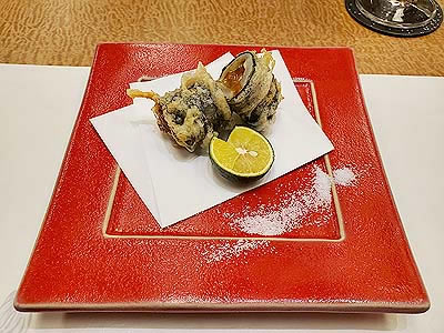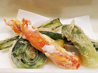 ![]() ずわい蟹の黄身焼 山菜の薄衣揚げ 山椒塩 こごみ タラの芽 |