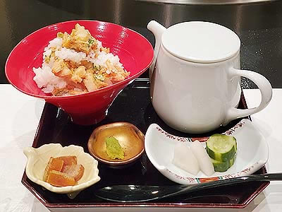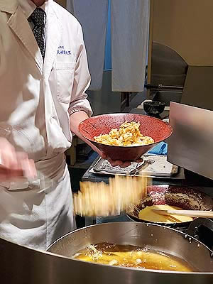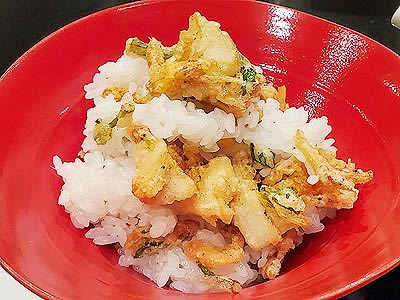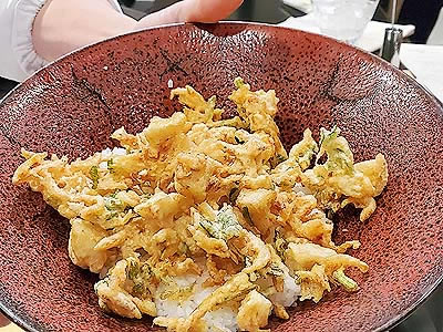 | 大きな器の | ご飯の上に掻き揚げが載せられ 副料理長が混ぜて仕上げ |