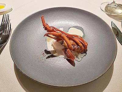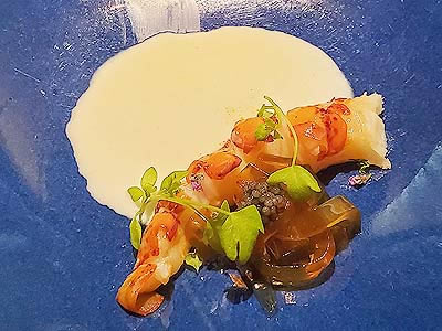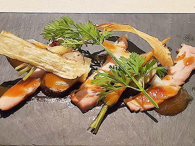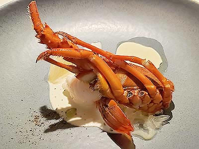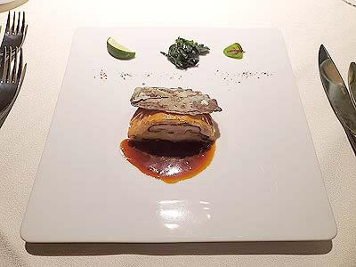 ![]() 炭火焼きの地鶏 甲殻類出汁のソース |