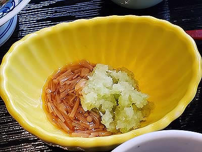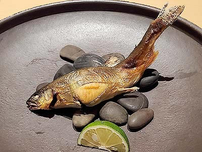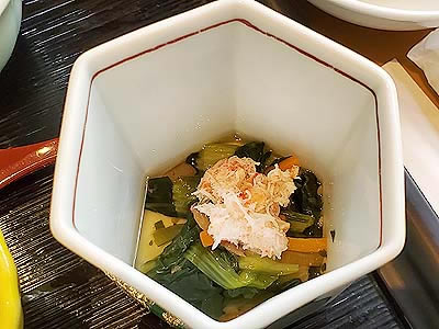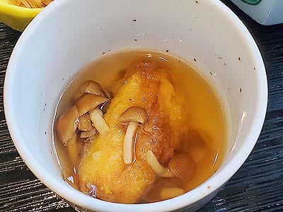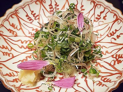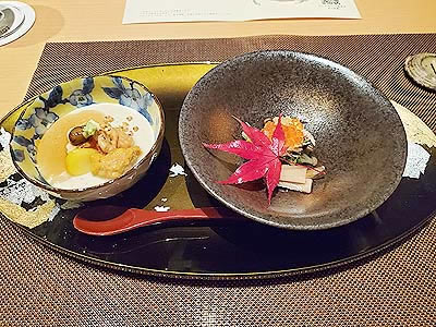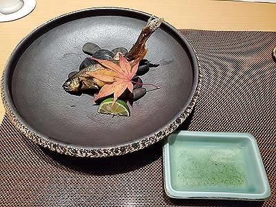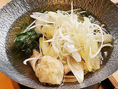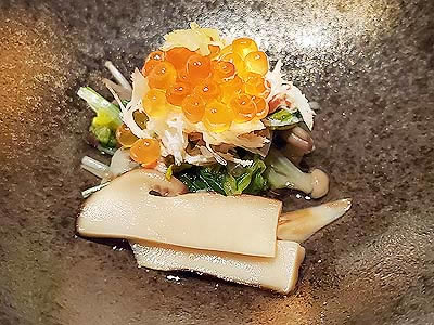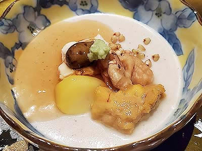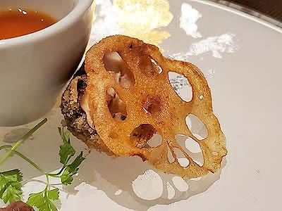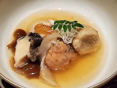 | 進肴 長野県産すっぽん飛龍頭 鮑 焼鱶鰭 海老芋唐揚げ 地滑子 針葱 木の芽 |
