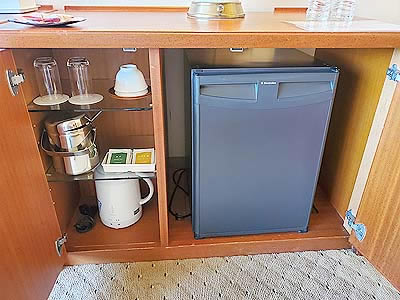 扉の中にはグラス類、湯沸かしポットと冷蔵庫