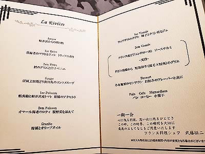 15,730円のコース「ラ・リヴィエール」をいただきました メニューにいつもの信太料理長の似顔絵と名前が無い! |