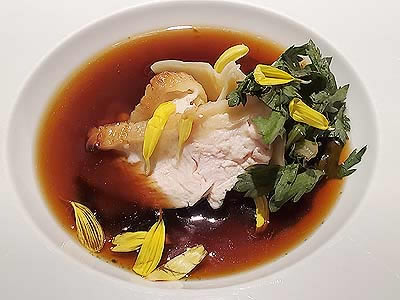| 下には軟骨とリコッタチーズのラビオリがあり 旨味と食感も楽しめます 春菊 菊花 |