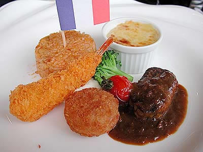 ![]() メインプレート コロッケ、海老フライ、チキンライス、グラタン、 ブロッコリー、焼きプチトマト、 ハンバーグ |