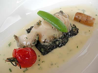 | 鮑のエチュベ 旬の地元野菜と香草バターのソースで 敷かれたイカスミリゾットとの相性良く クセのあるホドイモが面白かったです |