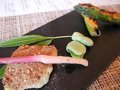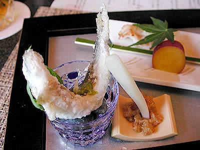 ![]() 推奨料理「千畳(せんじょう)」8,400円から、前菜 富田川産の稚鮎から揚げ 木の芽味噌 山独活 湯浅の金山寺味噌 |