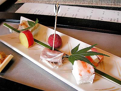 ![]() 奥から、きす酒盗焼き、丸十レモン煮 山桃蜜煮、水茄子生ハム巻き フルーツトマトモッツァレラ、子持ち海老 |