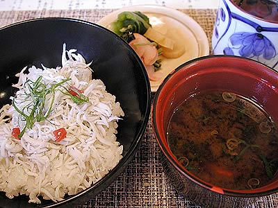 | 御食事 磯間港のしらす御飯か、冷やし玄米うどんからの選択で 磯間港のしらす御飯をいただきました 赤出汁 香の物 |