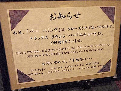 ![]() ナイトトレジャーの会場の横は 本館地下1階の「バー ハミング」ですが |