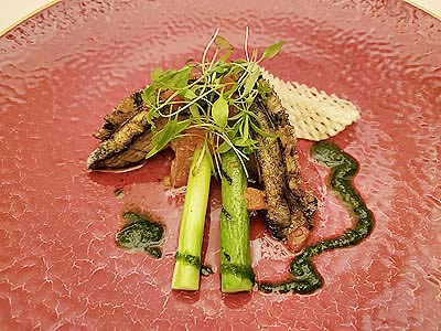 | 飲み物はお値打ちだったムルソーをいただきました | 13,200円のコースアズーリ 蛍烏賊とホワイトアスパラガスの酸味の強いマリネ |