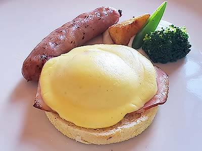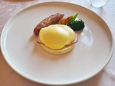 滋賀県産卵とベーコンのエッグベネディクト ポークソーセージ ポムピューレ 青味野菜