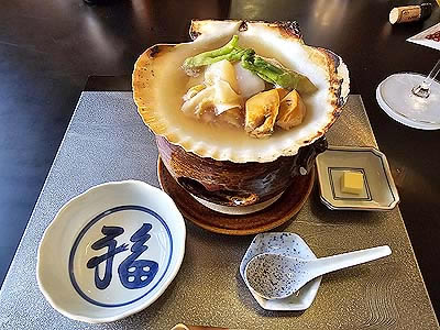 | オホーツク産帆立鍋 うるい たらの芽 よつ葉バター |