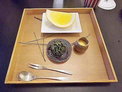 | 2皿目 | 根室産きんき炙り 茗荷 おかひじき |
