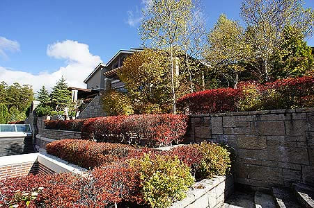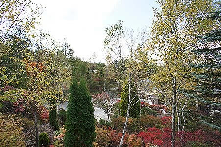 ![]() 7号館からお庭へのエントランスの紅葉は黄色 |