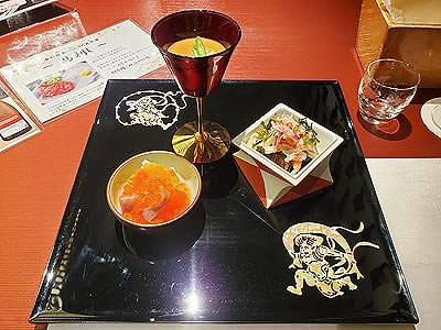 | 夕食をいただきに花木鳥へ 50周年記念ディナー 杜の詩(14,520円)をいただきました My Owner's dayサービスで半額となりました |